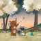 Art print of a bear and raccoon napping in a hammock in the woods.